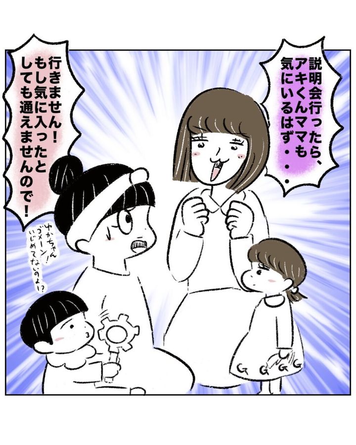 「説明会行ったら、アキくんママも気にいるはず・・」とセレブ幼稚園をごり押ししてくるゆかちゃんママに「行きません!もし気に入ったとしても通えませんので!」と必死に断るまるさん。