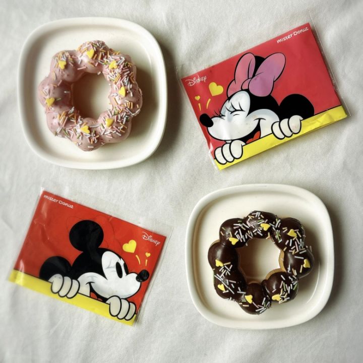 ディズニ―コラボドーナツとして、こちらの2種類も登場中。ポン・デ・リングにチョコレートをコーディング+キュートなシュガートッピングで、カラフルな見た目のドーナツです!ミッキーマウス&ミニーマウスの袋もかわいい♪