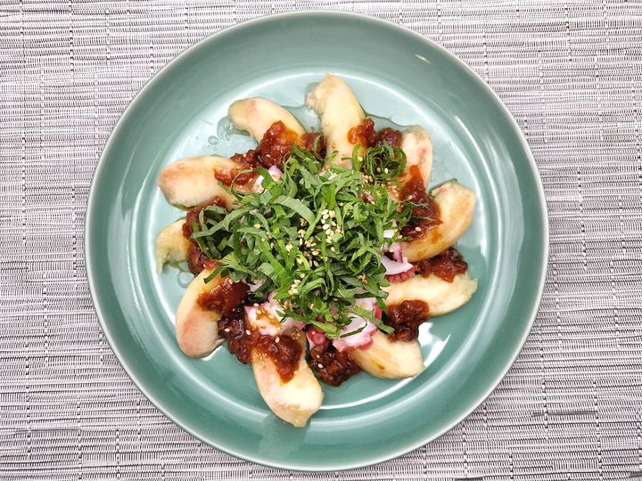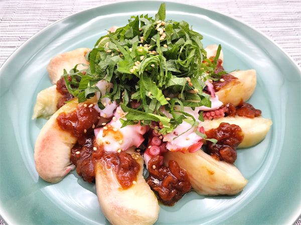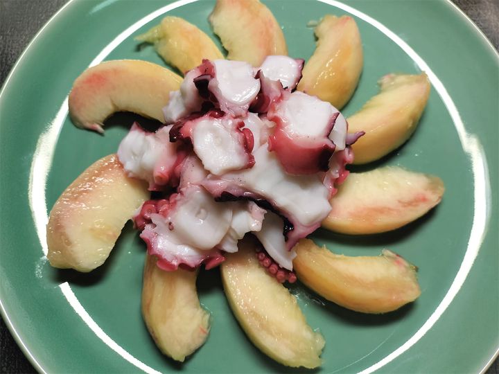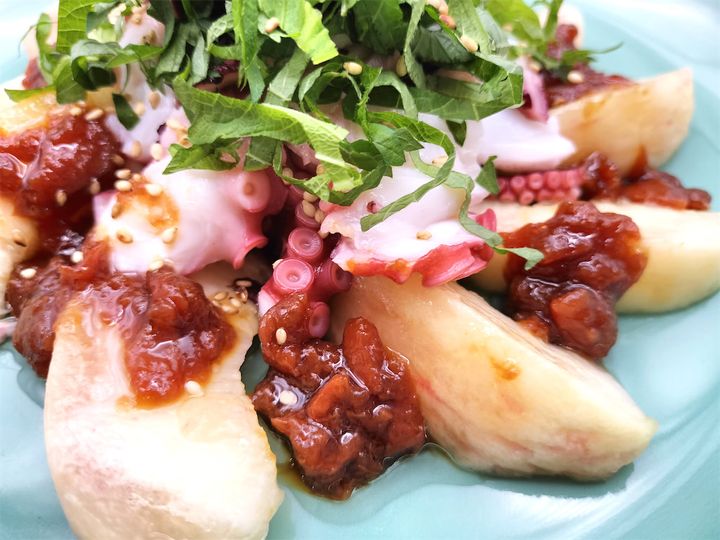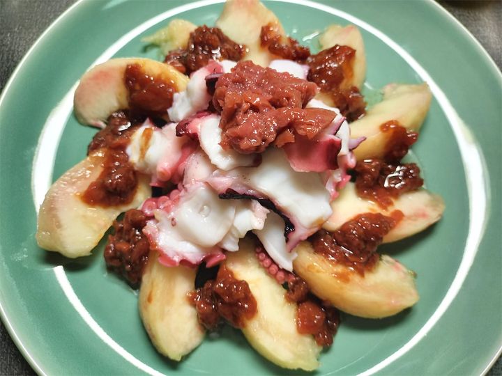 桃だけだと酸味があまり強くなく甘いのですが、そこに梅干しが加わることで、こんなにおいしくなるのかと驚かされました。そういえば酢だこがあるのですから、タコと酸味はとても合うはずです。