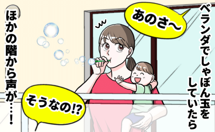 雨が続いていたとき。外遊びができなかったので、1歳になる息子とベランダでシャボン玉をして遊んでいました。マンションのベランダなので広くはありませんが、家のなかとは違う雰囲気に子どもは大喜び。楽しく過ごしていると、どこからか声が聞こえてきて……。