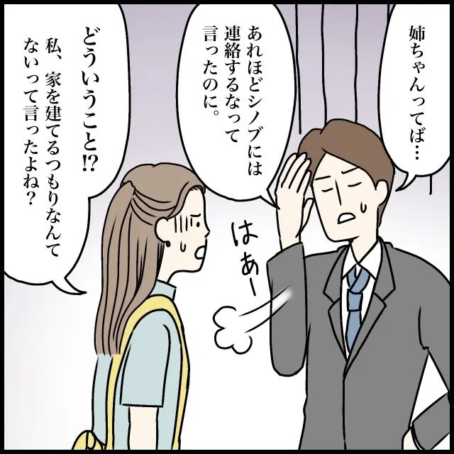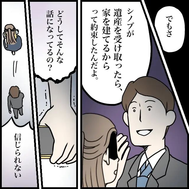 「でもさ、[シノブが遺産を受け取ったら、家を建てるから』って約束したんだよ」と真顔で言うナオヤに、「どうしてそんな話になってるの?信じられない!」怒りに震えながら家を出た私は、