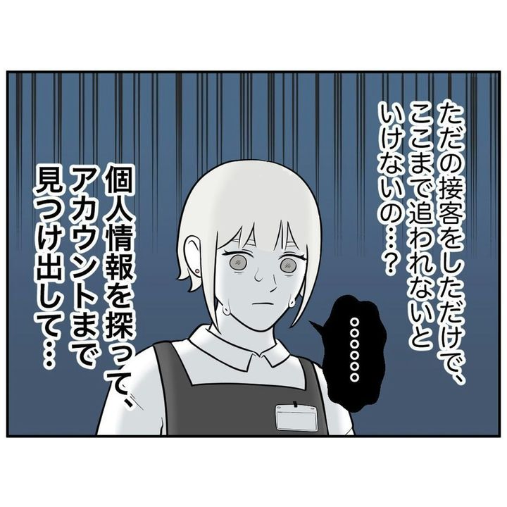 自分が我慢すればストーカー男も激昂せず、周りに迷惑もかけない…と思っていたほや助さんですが、SNSアカウントまで見つけられては恐怖心の方が勝りますよね。今回ほや助さんはお店で使っている「名札」から相手にフルネームが分かってしまいましたが、こうした些細なことがきっかけでストーカーは相手の情報を探るのでしょうね。