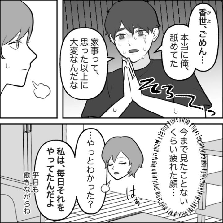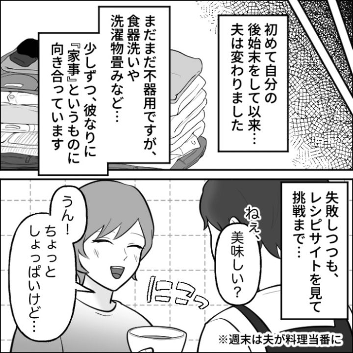 追い込まれて自分でやるしかなくなった夫。思っていた以上に大変だった家事を経験してようやく協力して毎日を過ごせる体制となりました。
