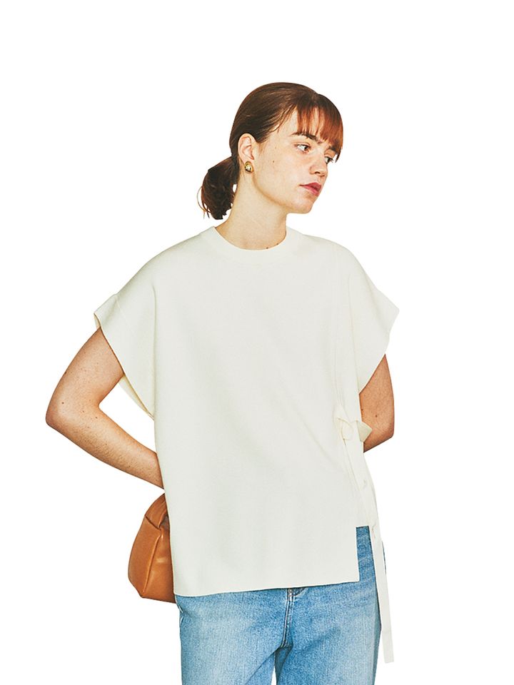 白ベルトニット/MANOF インナーを気にする必要のない、しっかりとした編み地の白ニット。ルーズなシルエットながら、サイドのリブディテールとベルトが効いて、単調になりがちな白も表情豊かに。リラックスした着心地と、きちんと感を両立させた優秀な一枚。広めのアームホールも、腕の華奢見せ効果にひと役。