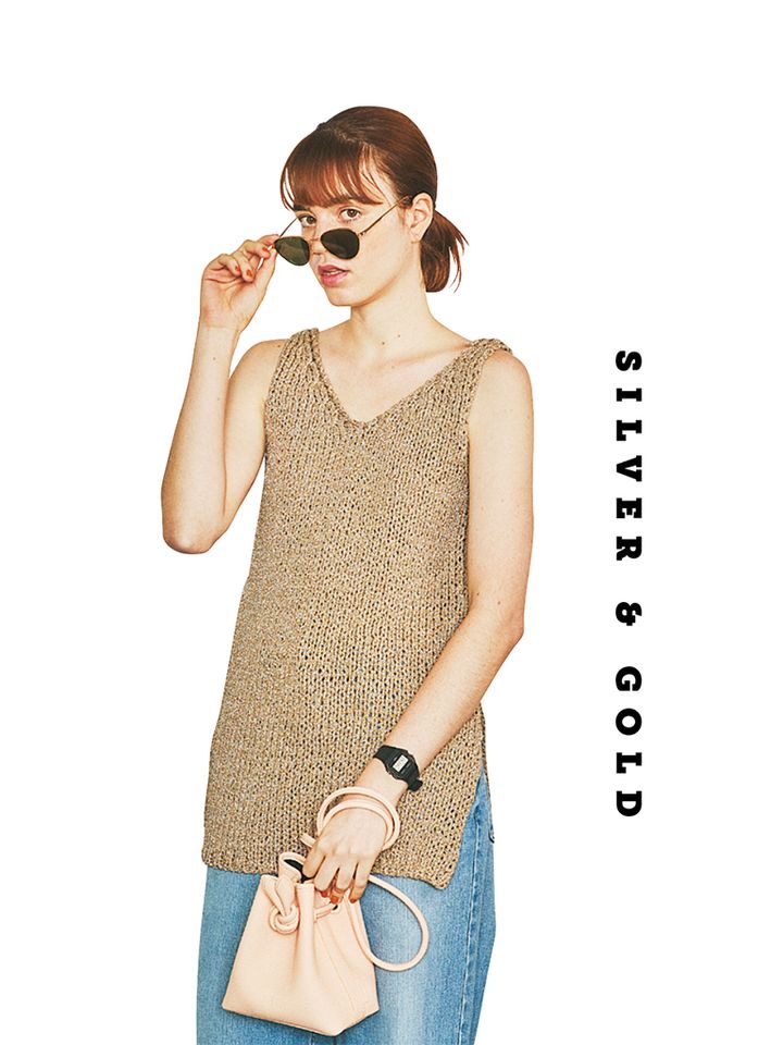 ラメニットトップス/オブリオ 胸元が詰まってなく、肌が見えることで「腕だけ出てる感」を中和する視覚効果。ラメニットの華やかさを、カジュアルなタンクトップシルエットで程よく和らげて。