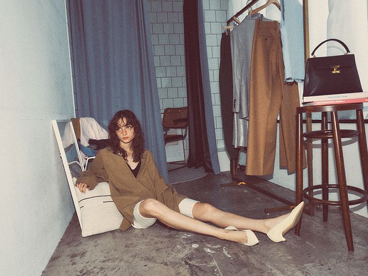 全身をベージュのニュアンスカラーでまとめても、肌感があるシースルーならメリハリよく。ボタンをきちんととめても動きが出せるメンズのようなゆったり感と繊細な素材による奥行き。