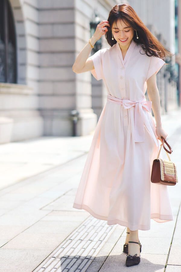 涼しげな素材感には爽やかさが宿り、暑い時期にもぴったり。リボンでのウエストマークで美シルエットに。