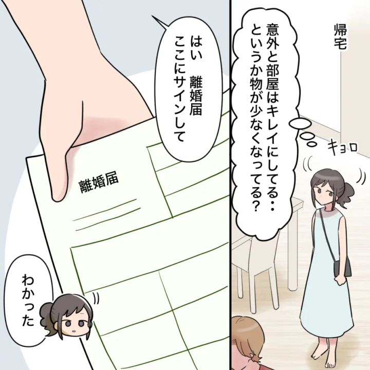 部屋を見渡して、「意外と部屋はキレイにしてる・・というか物が少なくなってる?」と何となく違和感を感じていると、「はい離婚届。ここにサインして」と差し出され、「わかった」と答えてサインしました。