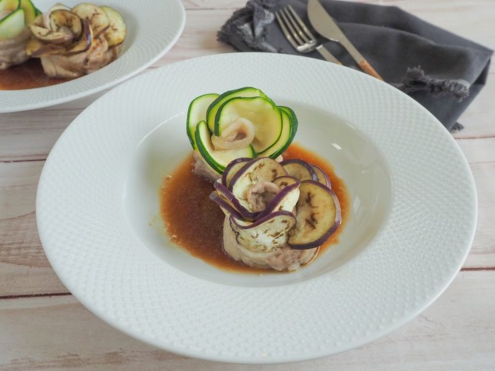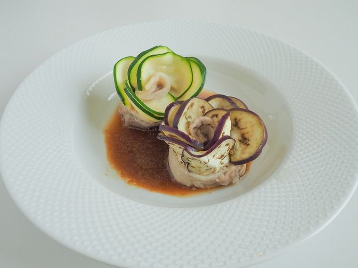 なすの皮を剥いてから水に濡らし、ラップに包んでレンチンして作る前菜。なすがカルパッチョに変身するなんて……新感覚ですよね!