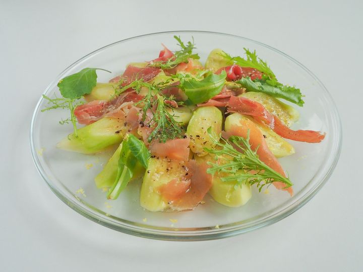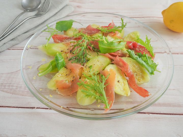 ジューシーでやさしい味わいのなすに、生ハムの塩味をプラス。味付けは、塩麹とレモン、はちみつがベースのさっぱりだけどコクのあるドレッシングです。