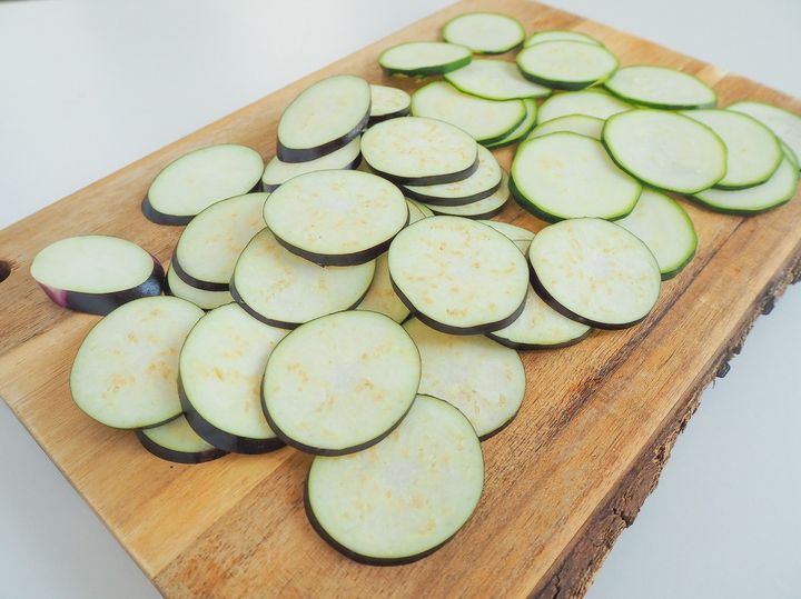 1. なすとズッキーニをそれぞれ包丁で極薄に20枚ずつ輪切りにする。