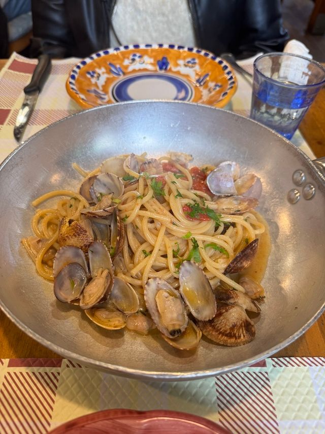ここで遅めのランチを取るのもおすすめ。海鮮が豊富なので、ランチではぜひボンゴレビアンコを! 海を望むテラス席でシーフードパスタと冷えた白ワインをいただけば、旅の幸福度は一気に最高潮に。
