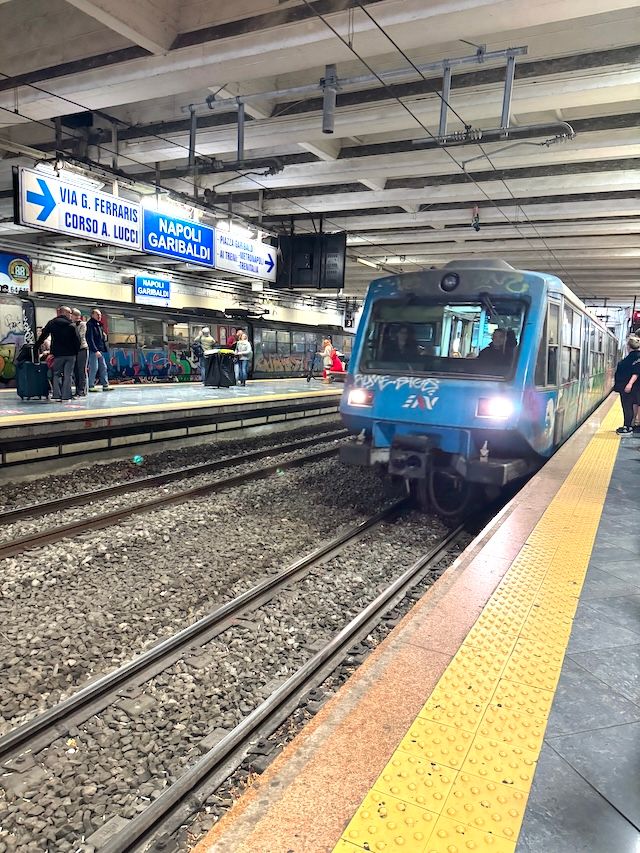 ナポリ中央駅の地下にある「Garibaldi(ガリバルディ)駅」から乗車。電光掲示板や放送がイタリア語オンリーなので、あらかじめ「Sorrento(ソレント)行き」と確認しておくと安心です。混雑を避けたい場合は、朝のラッシュを過ぎた9時以降の乗車がおすすめ。