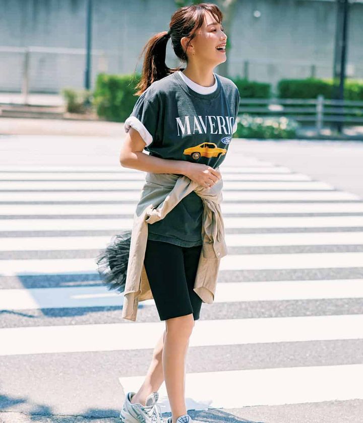 パンツ¥15,400(プロヴォーク デザイン ブティック/ジャック・オブ・オール・トレーズ プレスルーム)ロゴTシャツ¥6,380中に着たTシャツ¥6,380(ともにグッドスピード)腰に巻いたシャツ¥25,300(アルページュストーリー)バッグ¥7,480(バーセルフ)スニーカー¥19,800(ニューバランス/ニューバランスジャパンお客様相談室)ピアス¥79,200片耳価格(プライマル)Ford Motor Company trademarks and trade dress used under license.