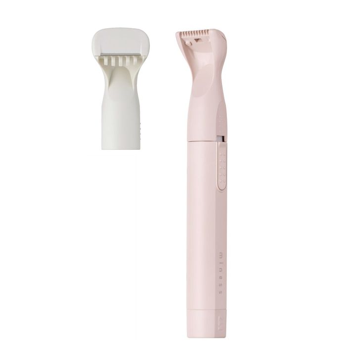 全剃り用と毛量を調整できるすきカミソリの2つの刃部がセット。音波振動を採用し、肌に与える刺激を軽減してなめらかな剃り心地を実現!miness VIOデリケートゾーン用カミソリ ¥1,980(貝印お客様相談室)