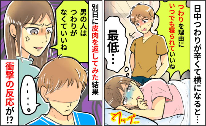 妊娠中、つわりがひどく日中も布団を敷いて横になっていると、夫から「つわりを理由にいつでも寝られていいね」と皮肉めいた言葉をかけられ……。