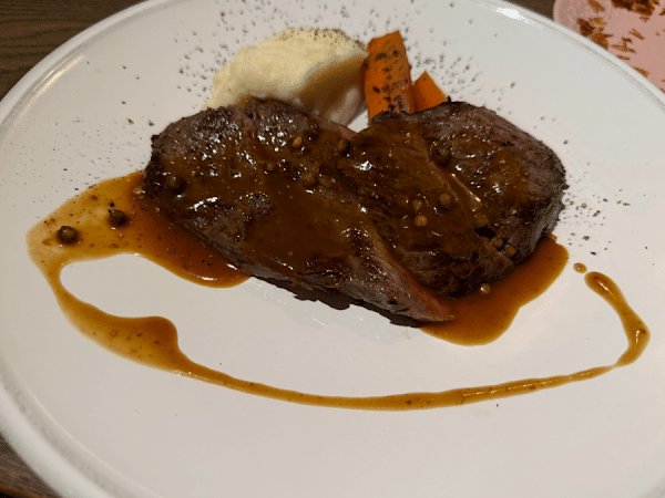 そしてメインは「和牛モモ赤身肉のステーキ グリーンペッパーソース」。