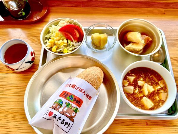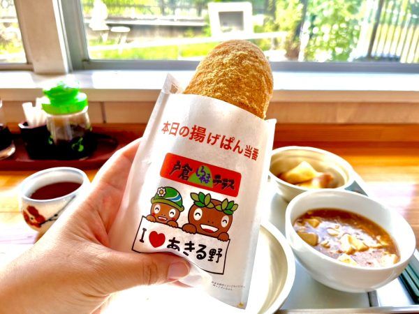 アルマイト製の食器が使われています!あげパンも揚げたてでホカホカでした。