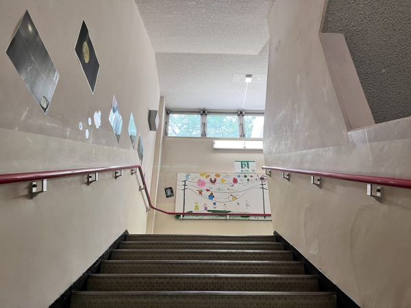 階段では、上から友達や先生が降りてきそうです。