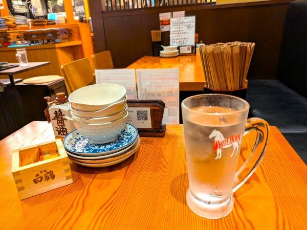 冷たいお水は、ホワイトホースのジョッキでド~ンと!お店の中央にはおでん食べ放題の屋台があります。