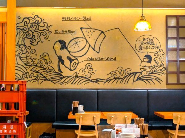 壁にはユニークなイラストが描かれています。おでん食べ放題のイラストと、