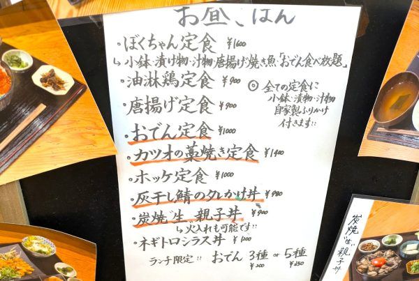 ランチメニューは、おでん定食・カツオの藁焼き定食・灰干し鯖のタレかけ丼・炭焼き生親子丼が推しのようです。すべての定食に小鉢・汁物・自家製ふりかけが付きます。また、ぼくちゃん定食は、小鉢・漬物・汁物・唐揚げ・焼き魚・おでん食べ放題が付くお得な定食です。