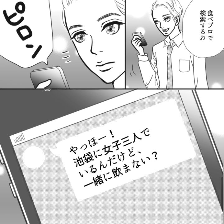 お店探しをしようとしたら圭太のスマホに友達の女の子から連絡が・・・。何やら複数人で飲んでいるらしく、一緒に飲もうということでした。タイミングが良すぎるこの誘いを同期に提案すると、戸惑いながらも乗り気なようです。