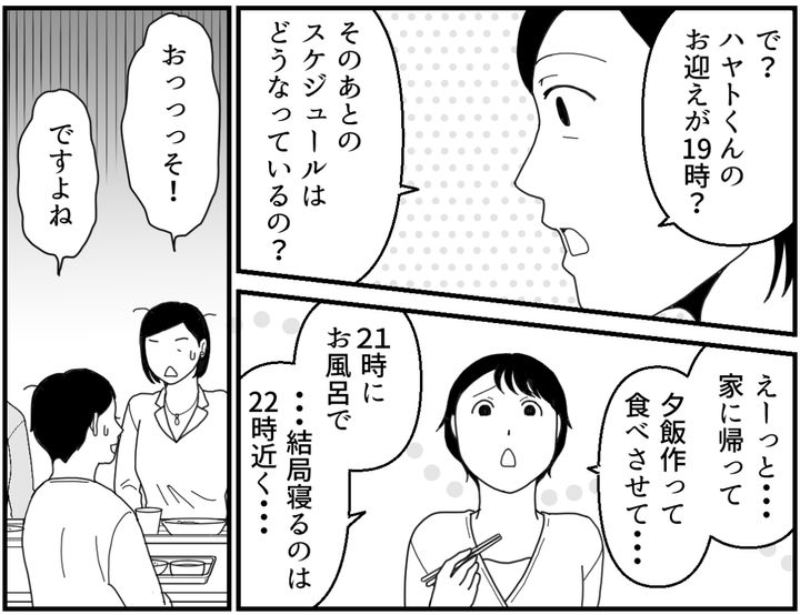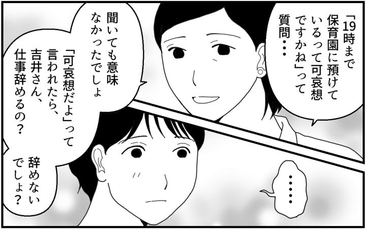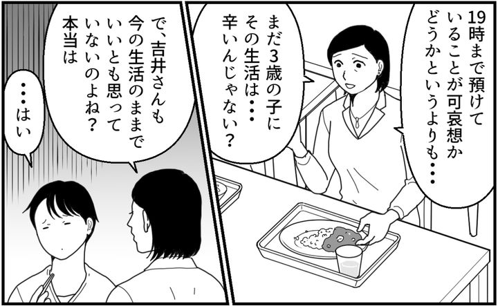私(ミホ)は3歳の息子ハヤトを育てています。時短勤務の期間が終わってからは、キャリアの遅れを取り戻そうと必死に働く毎日です。夫は帰宅が毎日23時と遅く、お迎えは私が担当。ただハヤトはとても寂しそうに私を待っているらしく、保育園の先生には「もう少しお迎えを早くできませんか」と言われてしまいました。ハヤトは可哀想な子だと思われているの? 翌日、思わず社食で愚痴ると関連会社の上長であるサヤカさんが「それ、聞いて意味ある?」と言ってきて……?