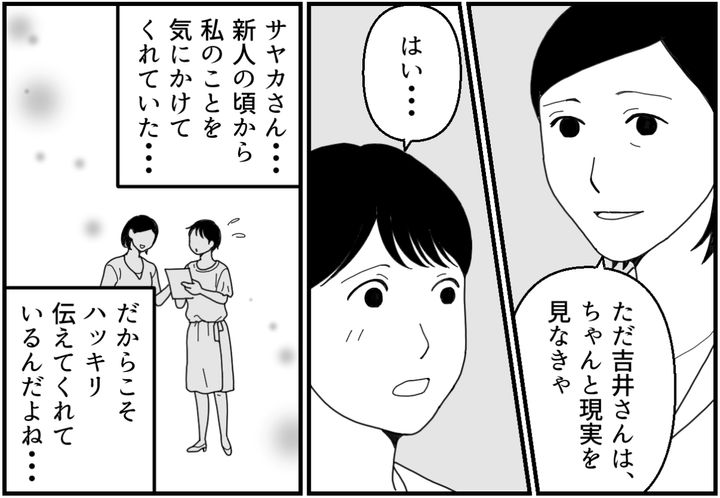 「吉井さんは、そんな無意味な質問して自分の気持ちを安定させようとしないで、現実を見なきゃ」「はい……」サヤカさんは新人の頃から私のことを可愛がってくれていました。だからこそハッキリ伝えてくれているのでしょう。
