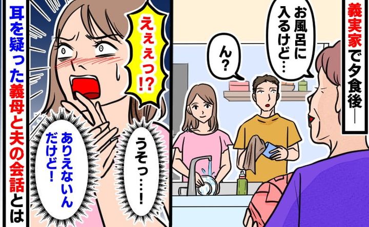 実家で夕食を終え、私と夫が食器洗いをしていると、義母が夫に「お風呂入るけど、入る?」と夫に声をかけました。聞き間違いかと思いましたが、夫は「入る」と答え、食器洗いを終えて、服を脱ぎ始めたのです。