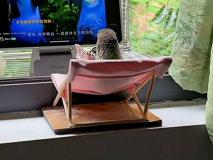 おやつ片手に鳥アニメを鑑賞! 映画館気分のオウムさんが可愛すぎる