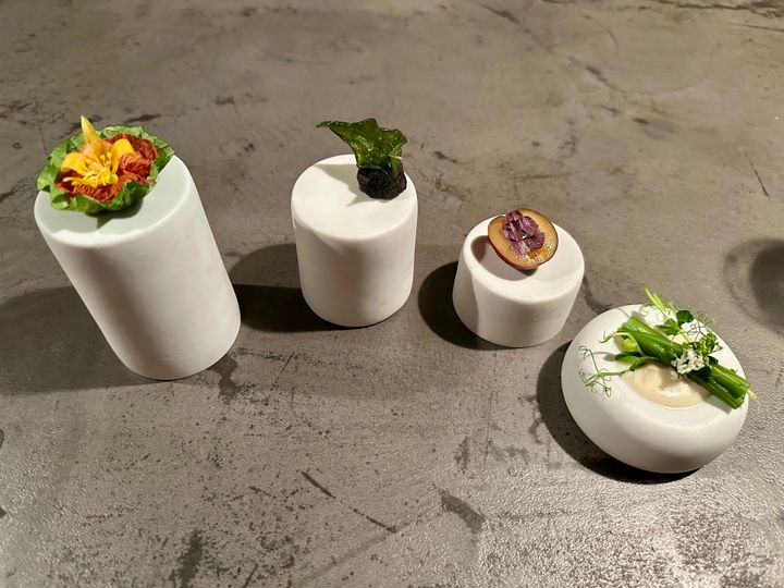 “見て美しい、食べておいしい”を体現した前菜の数々。まるでキャンバスのように配置された食材は、ひと口ごとに季節の香りが広がります。芸術品のような盛り付けに、心が踊ります。