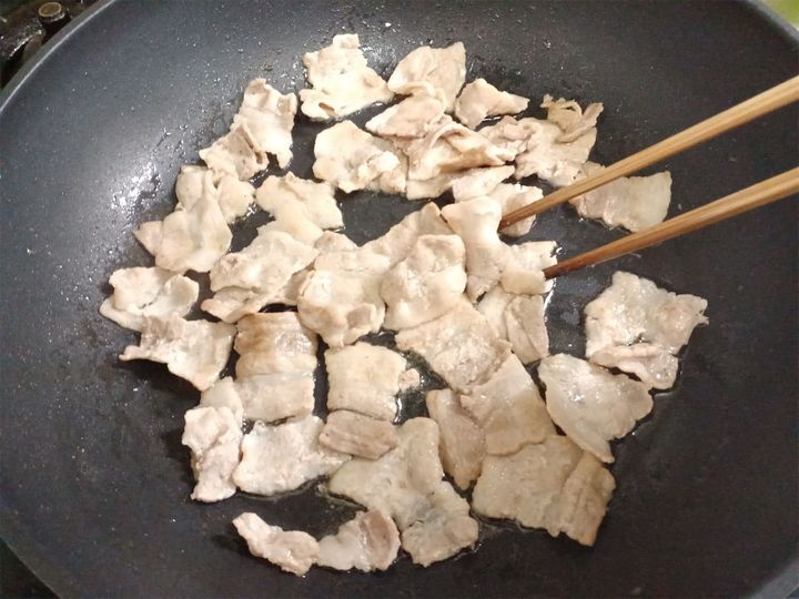 3. ゴマ油を熱したフライパンに、豚肉を入れて炒める。