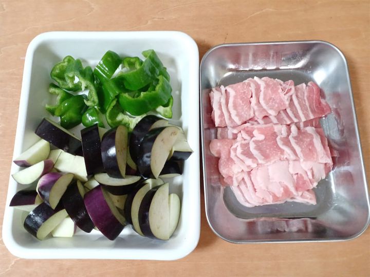 2. 豚バラ肉は3cm幅、なすとピーマンは縦半分に切って1~1.5cm幅に切る。