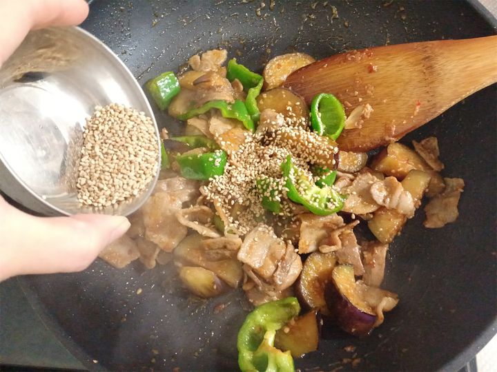 5. ピーマンを加え、合わせ調味料を入れて全体に絡めながら炒める。とろみがついたら、白いりゴマを加えて火を止める。