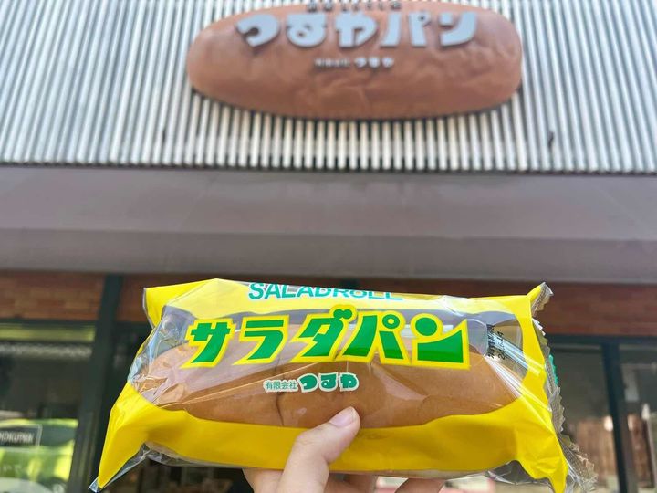 つるやパンの名物は、コッペパンに細かく刻んだたくあんとマヨネーズを挟んだ「サラダパン」。黄色と緑のパンチのあるパッケージが特徴です。