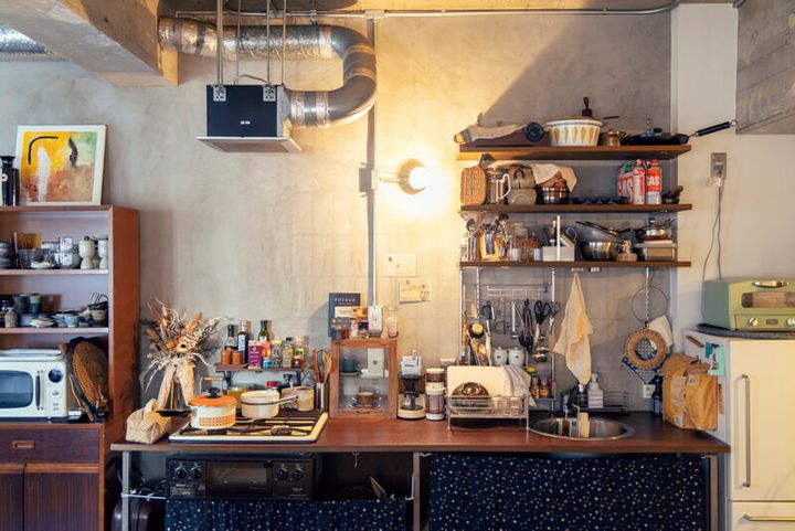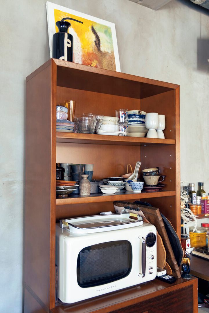 食器や電子レンジなどキッチン周りのものを収納するキッチンラックはカリモク。「食器は日本の作家さんの作品をはじめ、フランスやスペインなど世界各国から集めたものです」。棚の上にあるアートはアパレルショップ、TODAYFUL(@todayful_)のショップスタッフの作品。