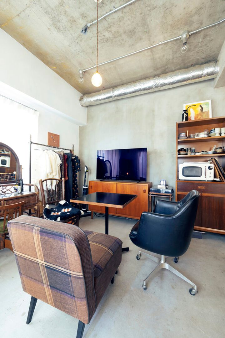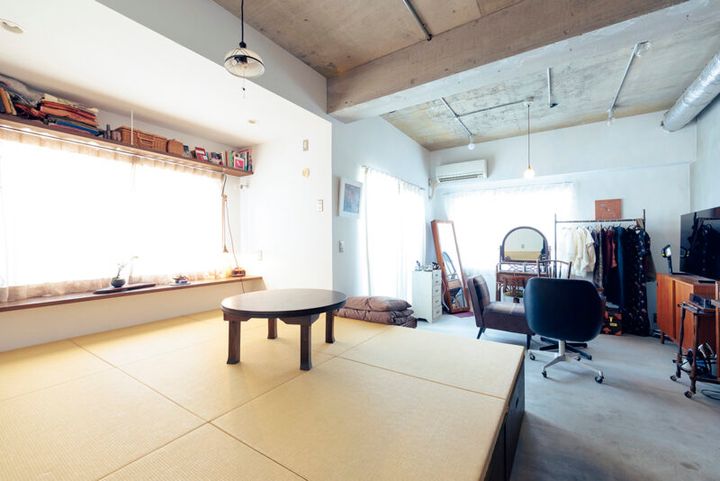 幼い頃にリフォーム番組で見た「小上がりのある空間」に魅せられたというあやかさん。会社の転勤がきっかけで、広島から東京に引っ越すことになった際に、出合ったのがリズム不動産の「Doma」をテーマにしたリノベーション物件。 小上がりの琉球畳のスペースを中心に、土間のようなモルタル仕上げの床という組み合わせは、まさにあやかさんが探していた空間そのものだったそう。 現在はあとから転勤が決まって合流した夫との二人暮らし。「家具は、私が独身時代から使っていたものがほとんどです。昔から古い家具が大好き。土曜日だけしかオープンしない古物や古着のセレクトショップ、HYST(@hystshop)がお気に入りでほしいものがある時は、行列に並んで購入します。 旅先で素敵なものに出合うことも。海外や地方に行くと骨董市や陶器市にも足を運びます。ほしいものを決めて探すというよりは、ふとした瞬間に“出合ってしまう”ことが多いですね」