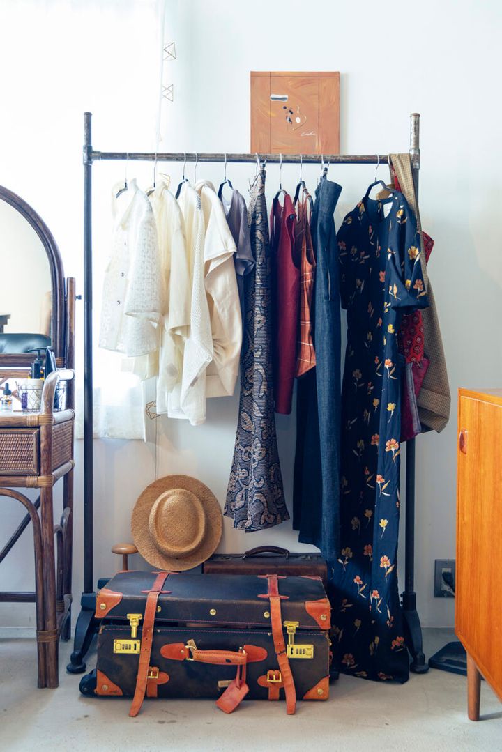 衣類はラックやトランクにまとめてすっきりと。「夫の衣類などは、すべて隠しています(笑)」