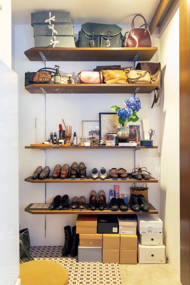 玄関の棚には、お香やルームフレグランスなど大好きな香りをレイアウト。ドアを開けるたびに素敵な香りが空間に広がる。