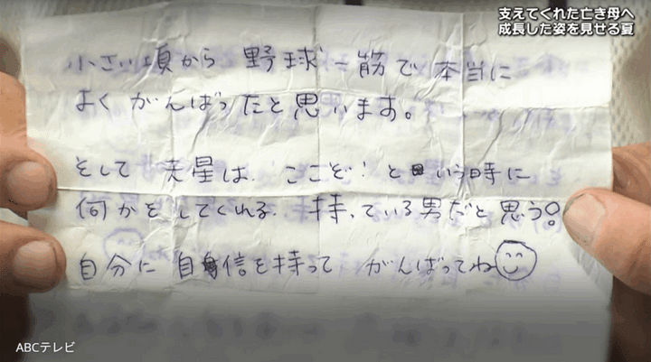 【TVer】すい臓がんのため60歳でこの世を去った、北海・吉井天星選手の最愛の母……。彼女が息子に綴った手紙 最後の言葉とは