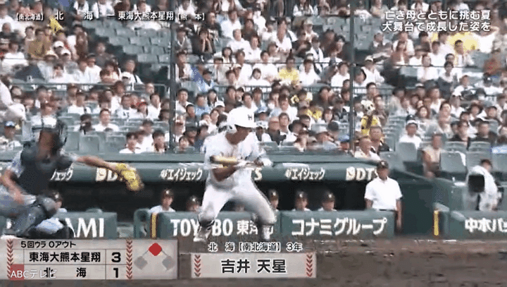 亡き母からいつも「一生懸命やれ」と言われていた吉井選手は、「(自分の)いいプレーするところを(母親に)見て成長を感じてもらいたい」という気持ちで、8月11日の東海大熊本星翔(熊本)戦へ。東海大熊本星翔がリードする5回裏、ノーアウト2塁のチャンスで吉井選手は送りバントを見事成功させ、仲間たちにつないだ! 彼のここぞという時の活躍によって、この回に北海は東海大熊本星翔と同点に追いついた。