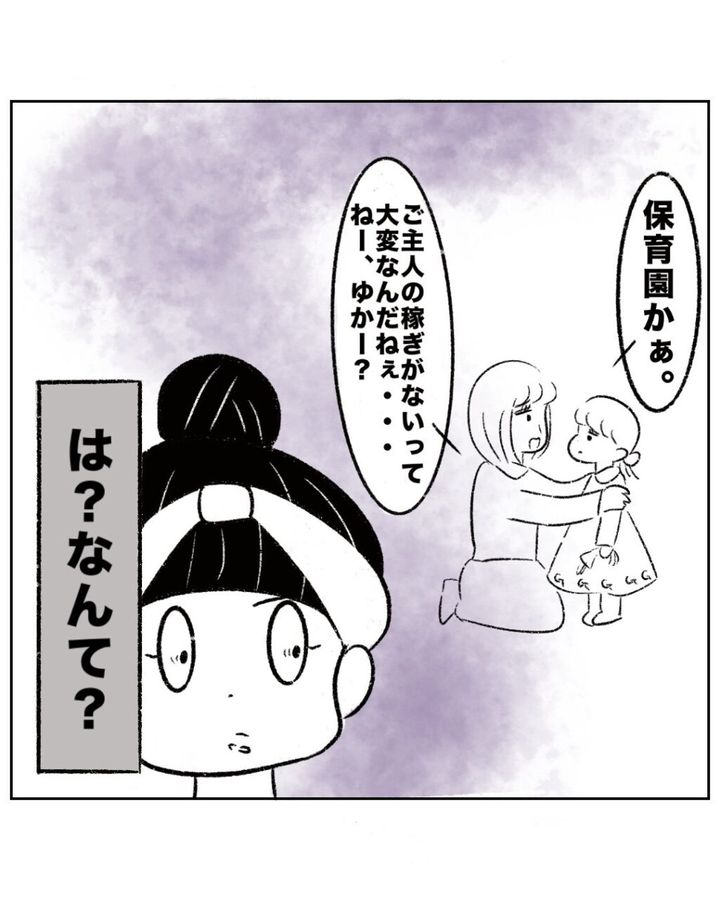 幼稚園を強くすすめてきたゆかちゃんママに保育園希望だと伝えると、「ご主人の稼ぎがないって大変なんだねぇ」と失礼すぎる発言をしたゆかちゃんママ。まるさんは「は?なんて?」と怒り心頭。