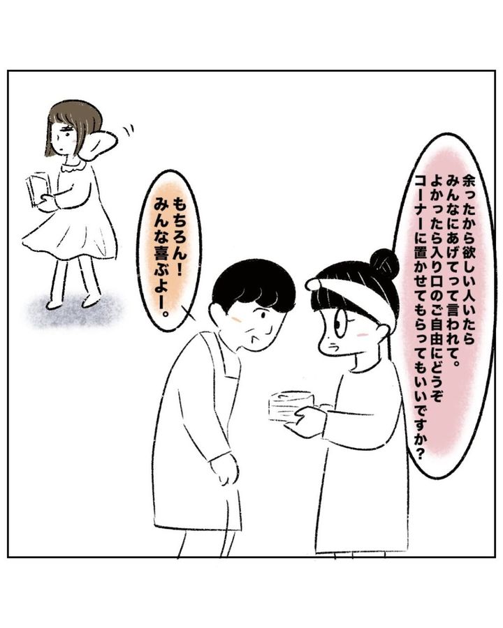 「余ったから欲しい人いたらみんなにあげてって言われて。よかったら入り口のご自由にどうぞコーナーに置かせてもらってもいいですか?」とまるさんが聞くと、先生は「もちろん!みんな喜ぶよー」と快諾。まるさんと先生のこのやり取りを聞いていたゆかちゃんママは、