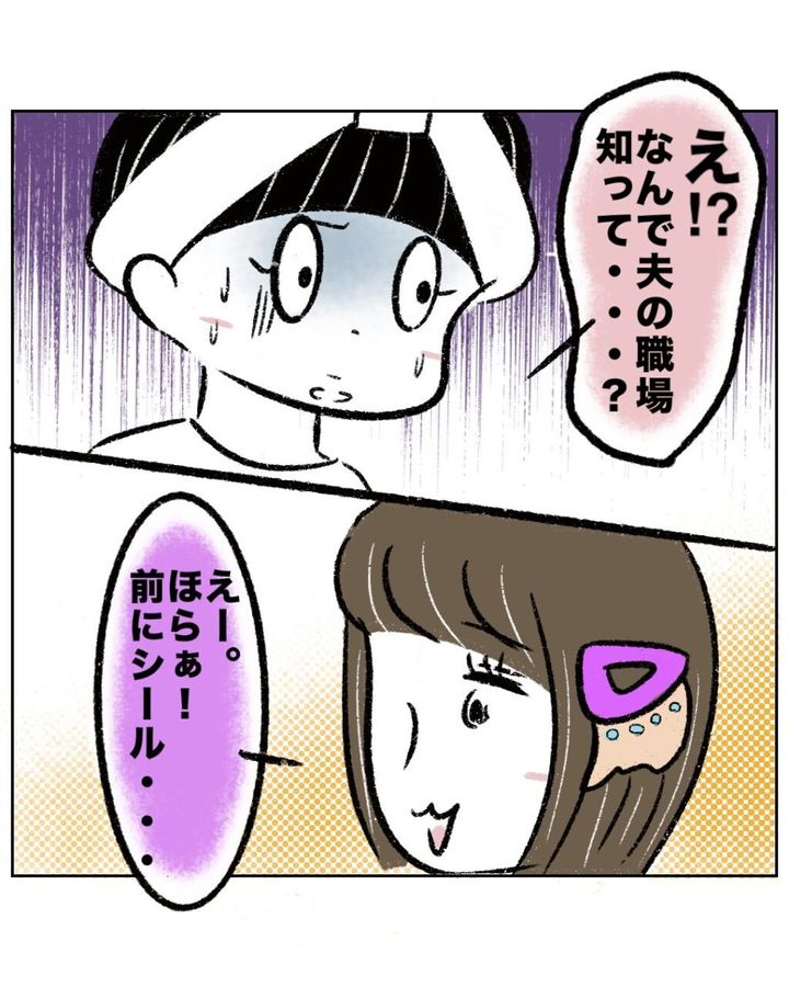ゆかちゃんママに話していないはずのご主人の勤務先を言い当てられたまるさんは「え!?なんで夫の職場知って・・?」と激しく動揺。すると、ゆかちゃんママは「えー。ほらぁ!前にシール・・」とあっけらかんと言いました。