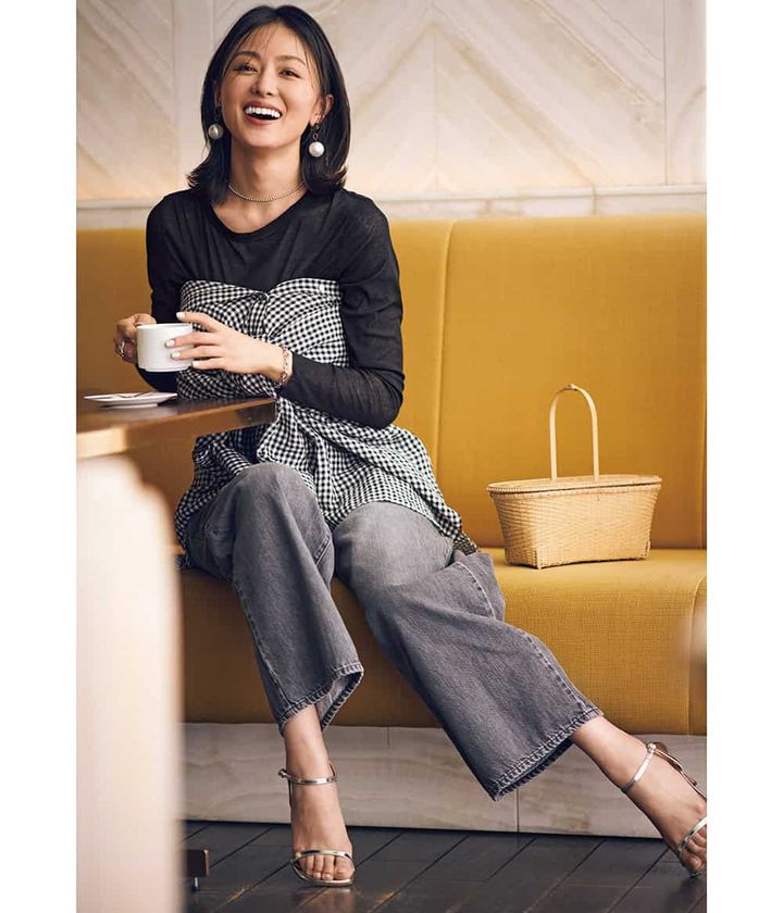 カットソー¥11,000(ギャバジン K.T/ファイブフォックス カスタマーサービス)シャツ¥8,910(Mila Owen/Mila Owen ルミネ新宿2店)デニムパンツ¥39,600(ヒステリックグラマー)バッグ¥122,100(BEPPU BAMBOO /セスタンテ)靴¥82,500(ペリーコ/アマン)イヤリング¥9,900リング¥16,170(ともにアビステ)ネックレス¥23,100 ブレスレット¥60,500(ともにマユ/マユ ショールーム)