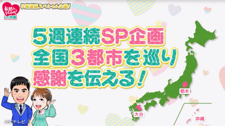司会3年目を迎えた、MCの藤井隆と井上咲楽。スタジオを飛び出し、5週にわたってお届けするスペシャル企画「MC就任3周年! 3都市サンキューツアー」がスタートした! 全国3都市、沖縄・栃木・大分を回り、感謝の気持ちをお届けする。
