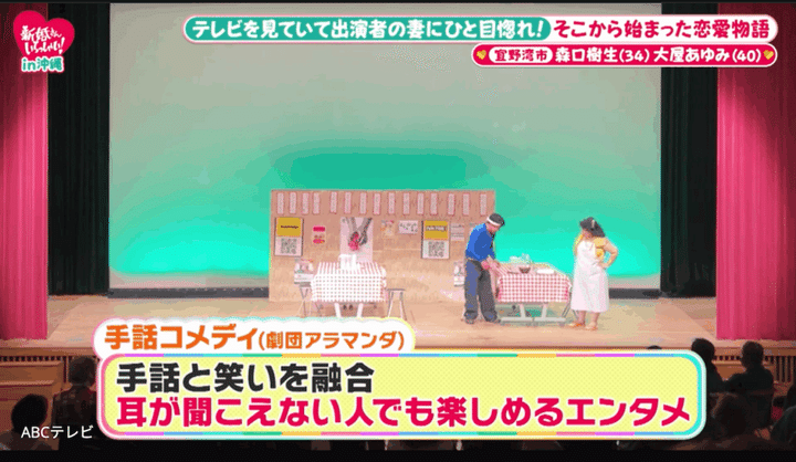 妻は、耳が聞こえない人でも楽しめる“手話コメディ集団”『劇団.アラマンダ』を主宰。沖縄のテレビ番組にも出演しているタレントだ。ある日、当時ホテルに勤めていた夫は、夜勤終わりにテレビを観ていて、画面にくぎ付けになった。
