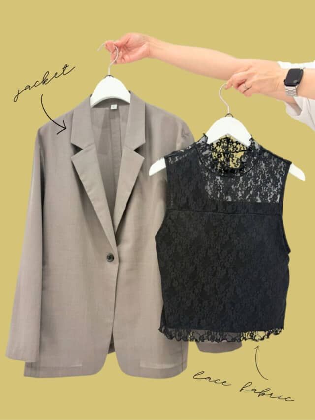 ▲シンプルな1つボタンジャケットとレースアイテムは大人コーデにぴったり