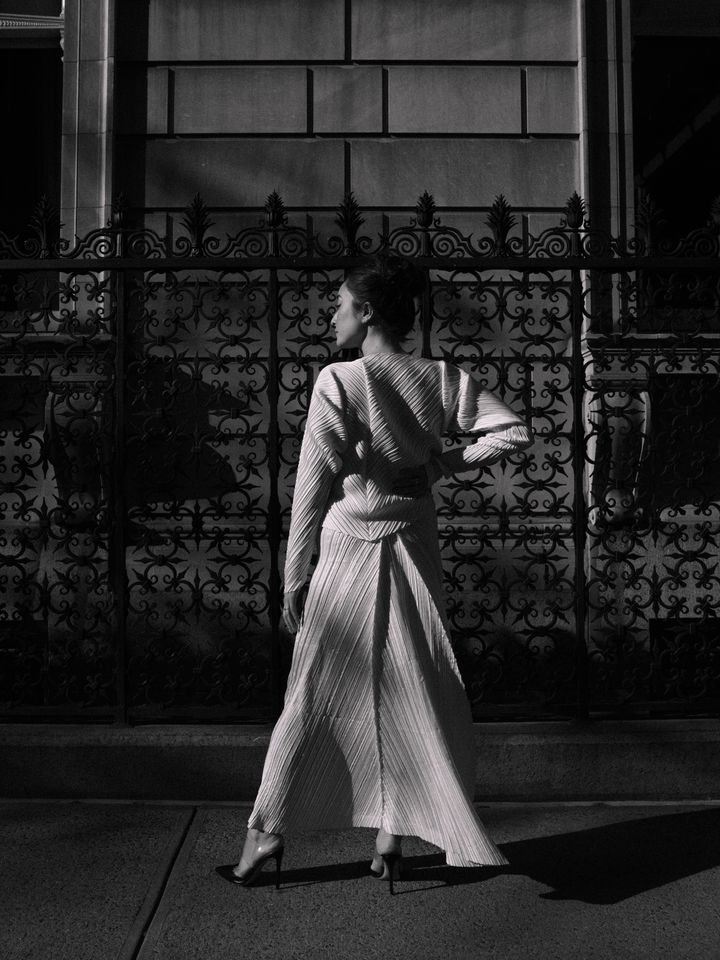 ウエディングドレス以外のルックを、ニケユは自身の日本のルーツにオマージュを捧げるものにしたかった。「最初に思い浮かんだのが、イッセイ ミヤケ(ISSEY MIYAKE)です。私にとって彼は単なるデザイナーではなく、実は私の両親が出会ったきっかけでした」と彼女は言う。「父が彼をアーヴィング・ペンに紹介し、それがふたりの長年にわたるコラボレーションと友情につながったんです。イッセイは私たち家族とずっと親しくしていて、彼にちなんで名づけられた弟のゴッドファーザー(名づけ親)でもあります」